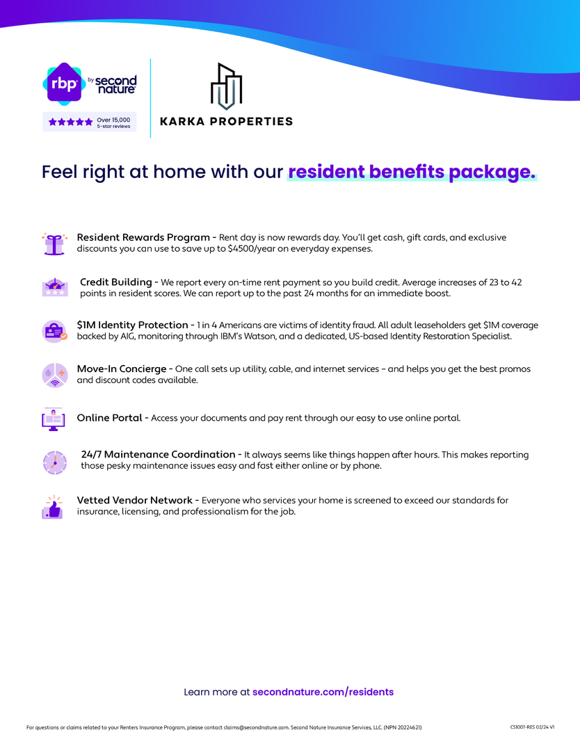 At Karka Properties LLC, we strive to provide an experience that is cost-effective and convenient. That’s why we provide a Resident Benefits Package (RBP) to address common headaches for our renters. Our program handles utility set up, credit building and more at a rate of $25.00/month, available to every eligible property upon resident election. More details upon application. In addition to RBP, we provide access to liability insurance that meets your needs.